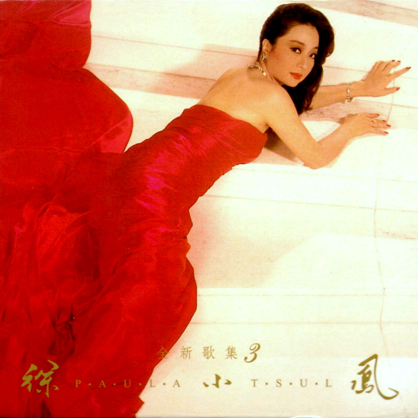 封面终于不再和杨凡这个“偏执审美狂”合作,不否认由杨凡设计包装的造型比之前贵气洋气许多,但只有这次称得上“大气”。私以为这是全新歌集系列中最佳的封面设计和拍摄照。甚至影响了离开康艺成音之后,宝丽金为小凤姐打造的经典造型设计。一“裙”入魂,在丽晶酒店内的云石楼梯上选景,1981年已有杨凡也已云石楼梯为背景,为甄妮的《忆梦》专辑拍摄过唱片封面。不过这次摄影师梁海平的作品灵光乍现,青出于蓝。据他在杂志上回忆起这段唱封的拍摄过程往事。选定了大酒店里的一幢大型云石楼梯,在旁是一大块一大块的玻璃,阳光穿透到地面,却不足以提供所需光线,用了一组射灯配合调节发光指数与阳光一致后,准备就绪。概念是要一个突出吸引的效果,小凤姐摆了多个POSE,但感觉离预期设想有出入,忽然灵机一动,用一匹达四十码长的红布,将她扮成“红衣女郎”,整个人卧在楼梯上,而红布则大幅地铺在地上,于是就诞生了经典的红白对比突出效果。
