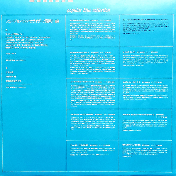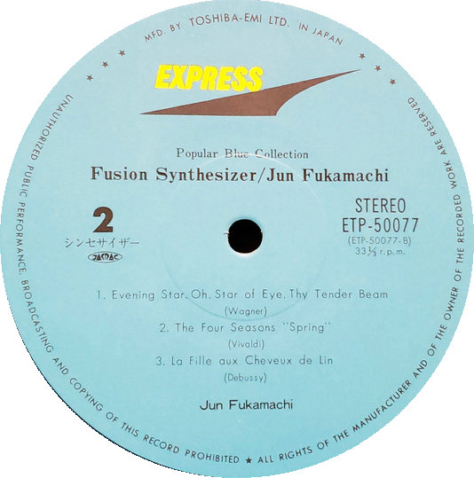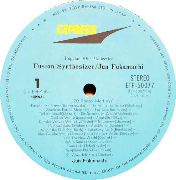 Jun Jiamachi- Fusion Synesizer Express - ETP-50077 黑胶唱片,LP,合辑,立体声,半透明蓝色黑胶唱片 国家:日本 发布:1980 类型:爵士乐、古典乐 风格:融合 A1 少女的祈祷/森林中的磨坊/美国巡逻队/为了爱丽丝/土耳其进行曲/森林中的施米德/布谷鸟圆舞曲/朱顶红/多瑙河波浪/特劳梅雷/海登罗斯林/圣母颂/G弦上的空气/第五交响曲/蓝色多瑙河圆舞曲/林之女/来自新世界/马刀舞曲/天鹅湖/第九交响曲 A2 Ave Maria B1 晚星:哦,夏娃之星,你温柔的横梁 B2 四季-春天 B3 La Fille Aux Cheveux De Linin