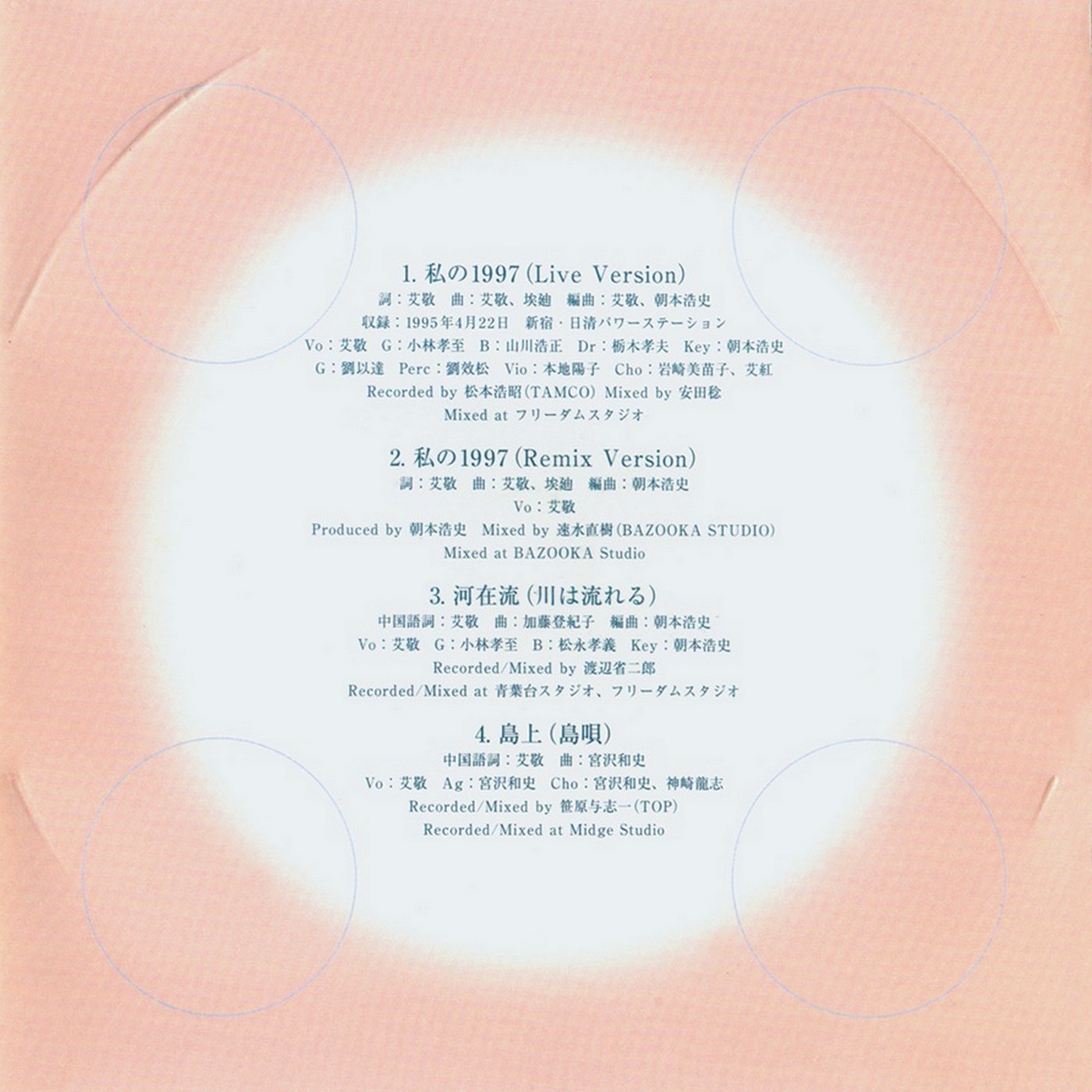 1992年《我的1997》在亚洲爆红后,艾敬签约日本索尼音乐,开始拓展海外市场。这张EP是她在日本的重要发行之一,收录了现场版、Remix版的《我的1997》,以及两首全新日文/中文双语作品,既延续了她标志性的城市民谣风格,也加入了国际化编曲与现场演绎的质感。